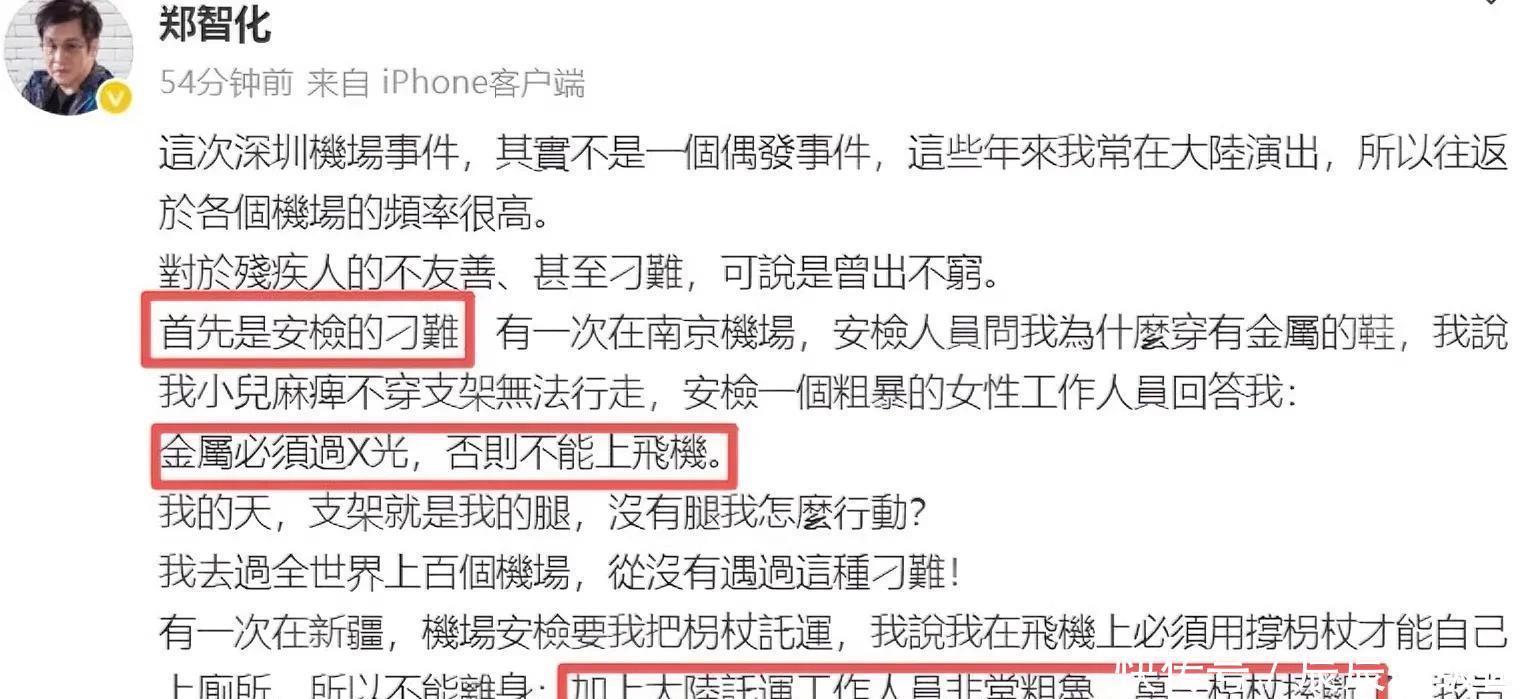 然而反转猝不及防。26日网友曝光的现场视频显示:两名工作人员全程协助推行轮椅、搀扶登机,与“连滚带爬”的描述形成鲜明反差。郑智化随后发表长文,历数南京机场质疑其金属支架安检、新疆机场强制托运拐杖等遭遇,直言“因乘机被刁难萌生退意”。一场对服务质量的投诉,迅速演变为舆论混战。