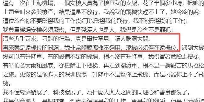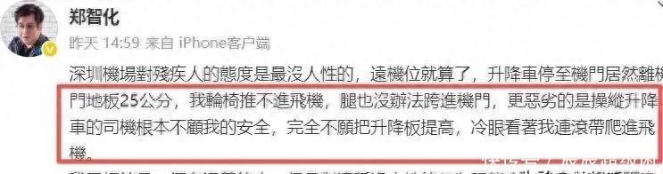 2025年10月25日,歌手郑智化的一条微博在互联网激起千层浪。这位以《水手》激励无数人的音乐人,公开控诉深圳机场的服务体验:升降车与飞机舱门存在25厘米高度差,轮椅无法推进,而工作人员“态度冷漠”更让他心寒。他形容自己“连滚带爬进入机舱”,字里行间充满失望与愤怒。